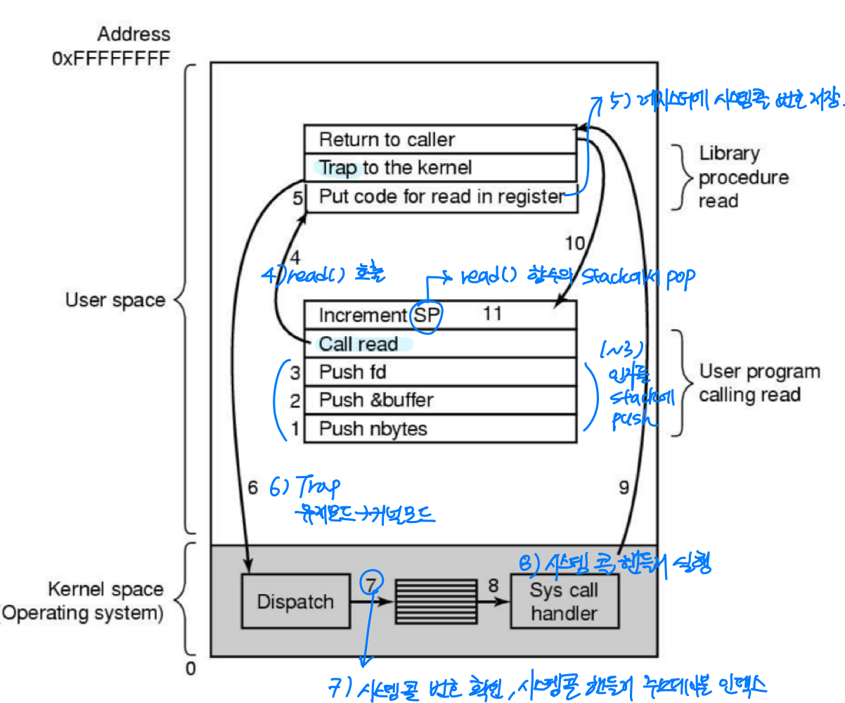 - 유저 프로그램이 시스템 콜 호출, 유저 모드에서 커널 모드로 진입하기