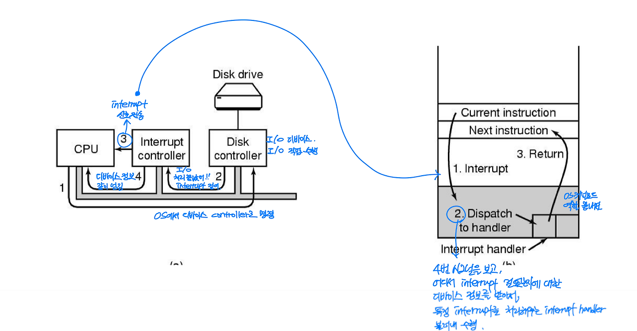 - 디바이스 하드웨어가 interrupt 신호를 발생시키면 OS가 커널모드로 전환
