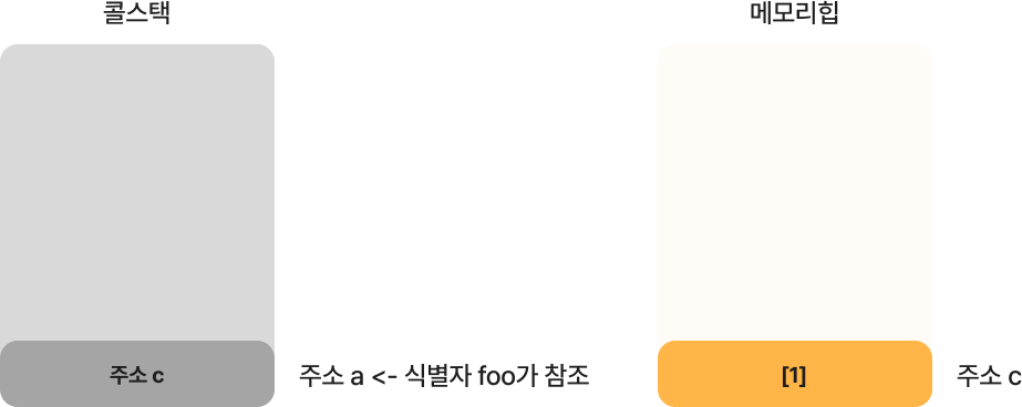 const foo = []; // 변수 foo에는 []이 저장된 메모리힙의 주소값이 저장된 콜스택 메모리의 주소값이 저장