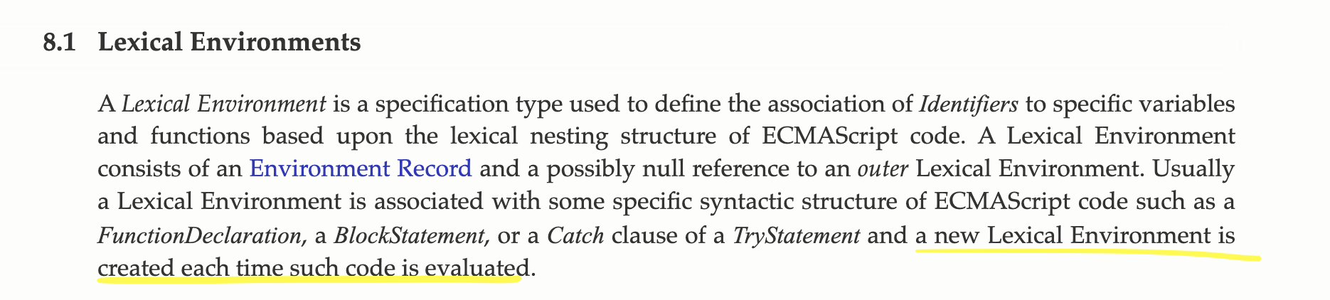 책에 "함수가 실행될 때마다 렉시컬 환경이 생성된다" 등의 언급이 있어 헷갈려서 ECMAScript 공식문서를 찾아보았다. 코드가 실행(execution)이 아니라 평가(evaluated)될 때 생성됨이 확실하다.