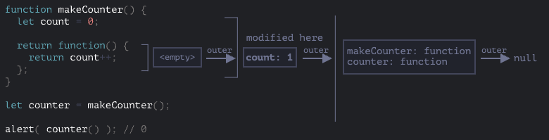 - counter.[[Environment]]에는 {count: 0}이 있는 렉시컬 환경에 대한 참조가 저장된다.
