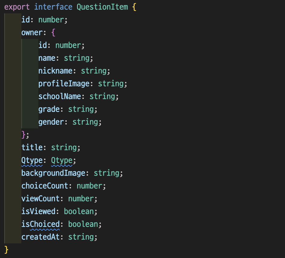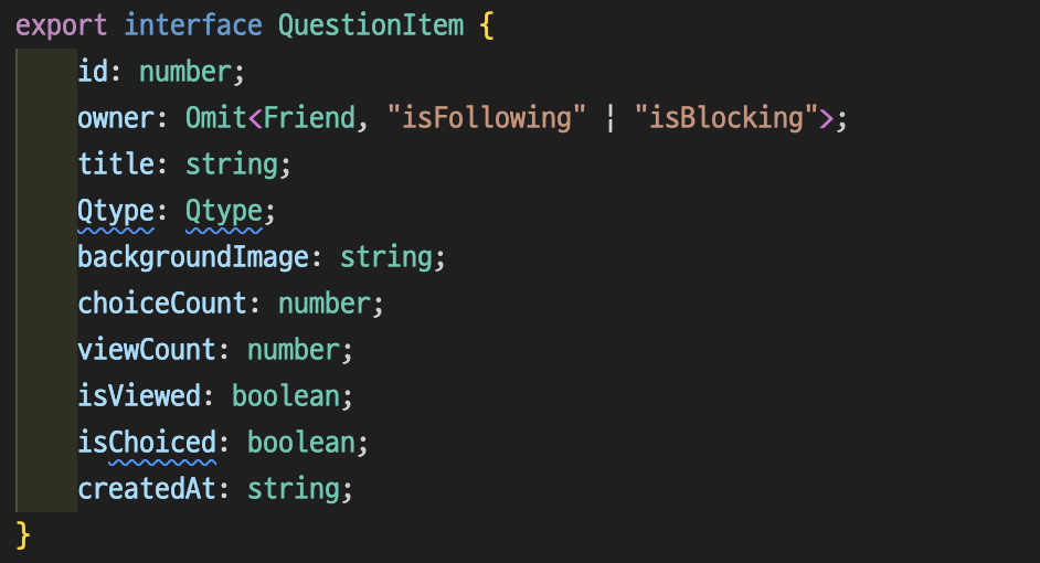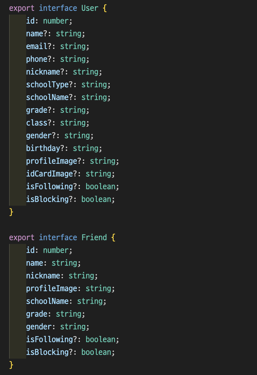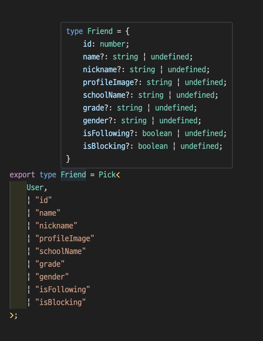 이 코드의 문제점은 User와 Friend 인터페이스를 작성할 때 수작업으로 타이핑해야 하고, 이에 따라 두 인터페이스가 공통적인 속성들을 가지고 있음에도 그 속성들이 동일한 타입인지 보장하기 어렵다는 점이다.