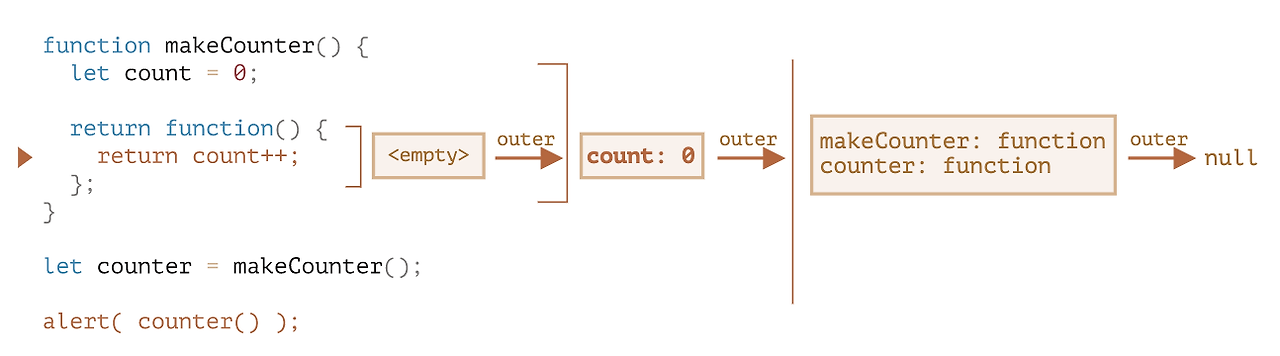 - 함수 makeCounter()를 호출하면 내부 함수 function() { return count++ }가 반환된다.